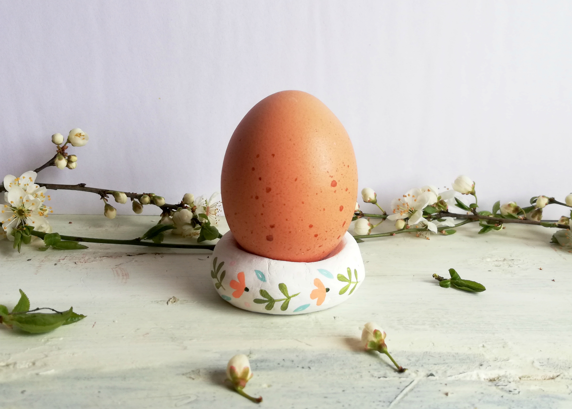 1. Iz modelirne mase oblikujemo kroglico. Vanjo nato potisnemo trdo kuhano jajce, da dobimo vdolbino, v kateri bo pirh stabilen. Iz te osnove oblikujemo gnezdo, ki ga nato poljubno pobarvamo in poslikamo z akrilnimi barvam in zaščitimo z akrilnim lakom.