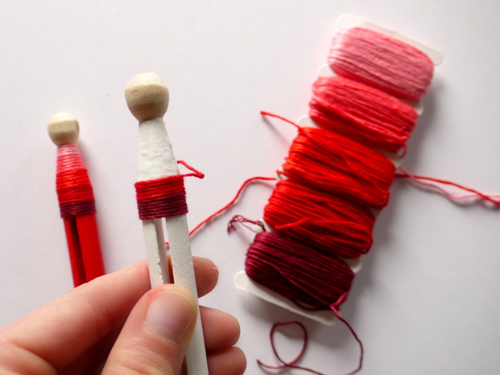 Potrebujemo lesene ščipalke z okroglim vrhom, lesene palčke, akrilne barve, barvno prejo za vezenje ali volno, filc, univerzalno lepilo, Scotch lepilo ali lepilo za filc, čopič in škarje.