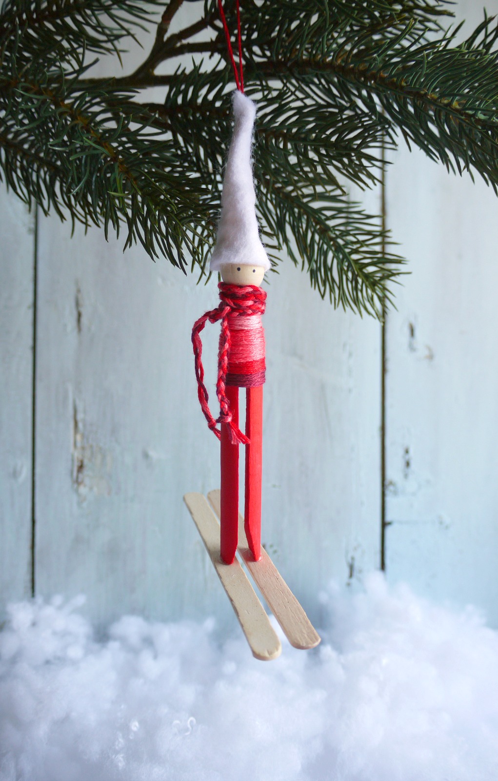 Na spodnji del ščipalke prilepimo lesene paličice, ki bodo služile kot smuči. Nato našim palčkom narišemo še oči, da jih ne bo zeblo, pa iz preje spletemo kitko, ki bo služila kot šal.