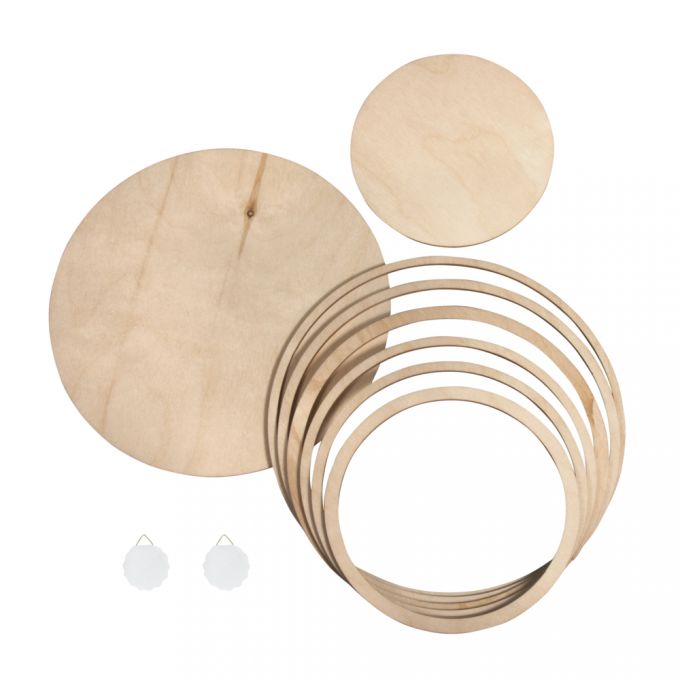 Sestavimo kompozicijo po želji. Obroče in plošči med seboj zlepimo z lepilom za les in pustimo, da se le-to dobro posuši.