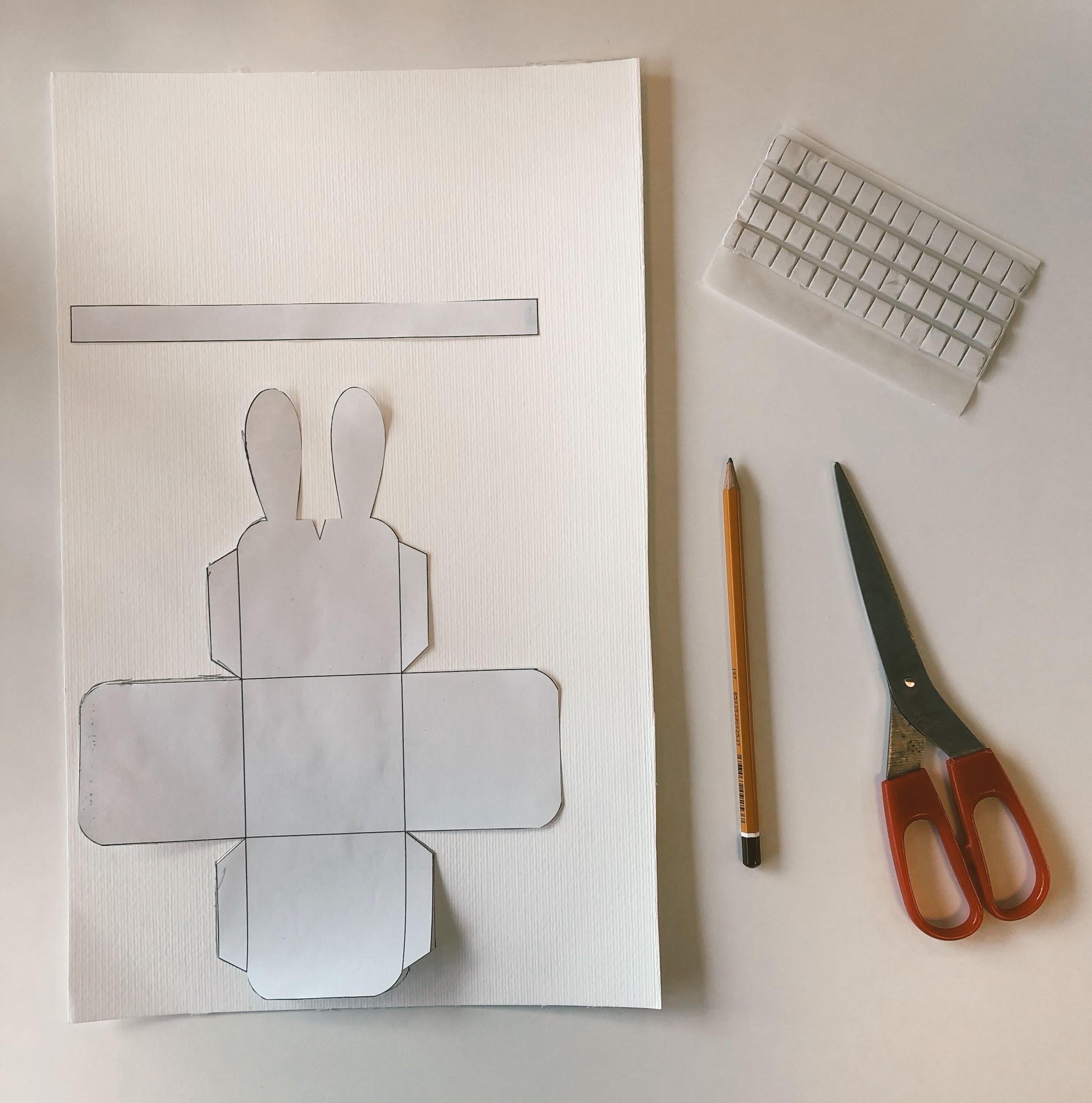 Najprej natisnjeno predlogo izrežite po zunanjih robovih. Nato predlogo uporabite kot šablono in na debel list narišite obris le-te (mi smo uporabili 300g papir). Trši papir smo izbrali, da bo košarica z lahkoto prenašala pirhe in čokoladna jajca. Če nimate 300g papirja lahko uporabite tudi kakšno škatlo.