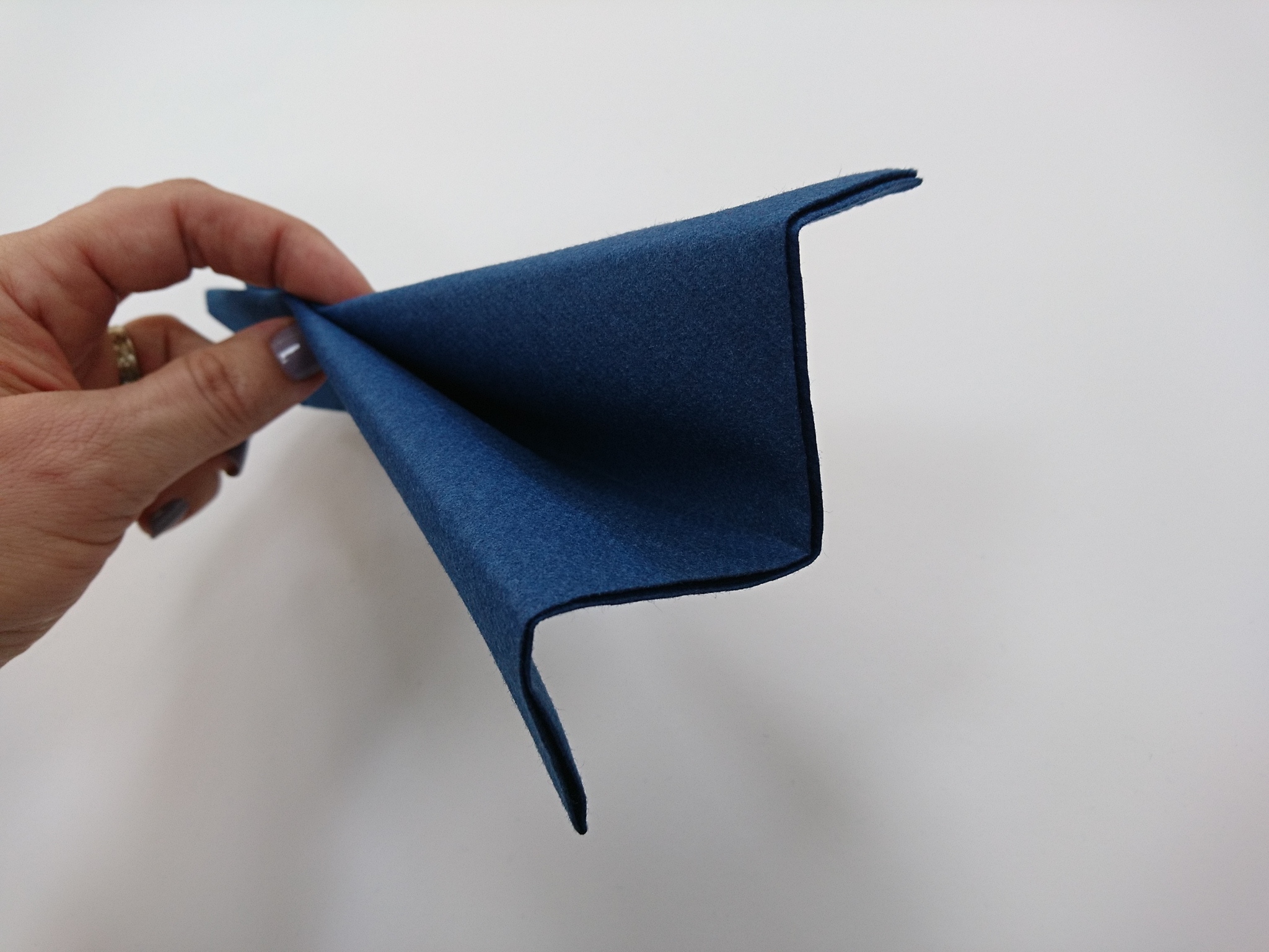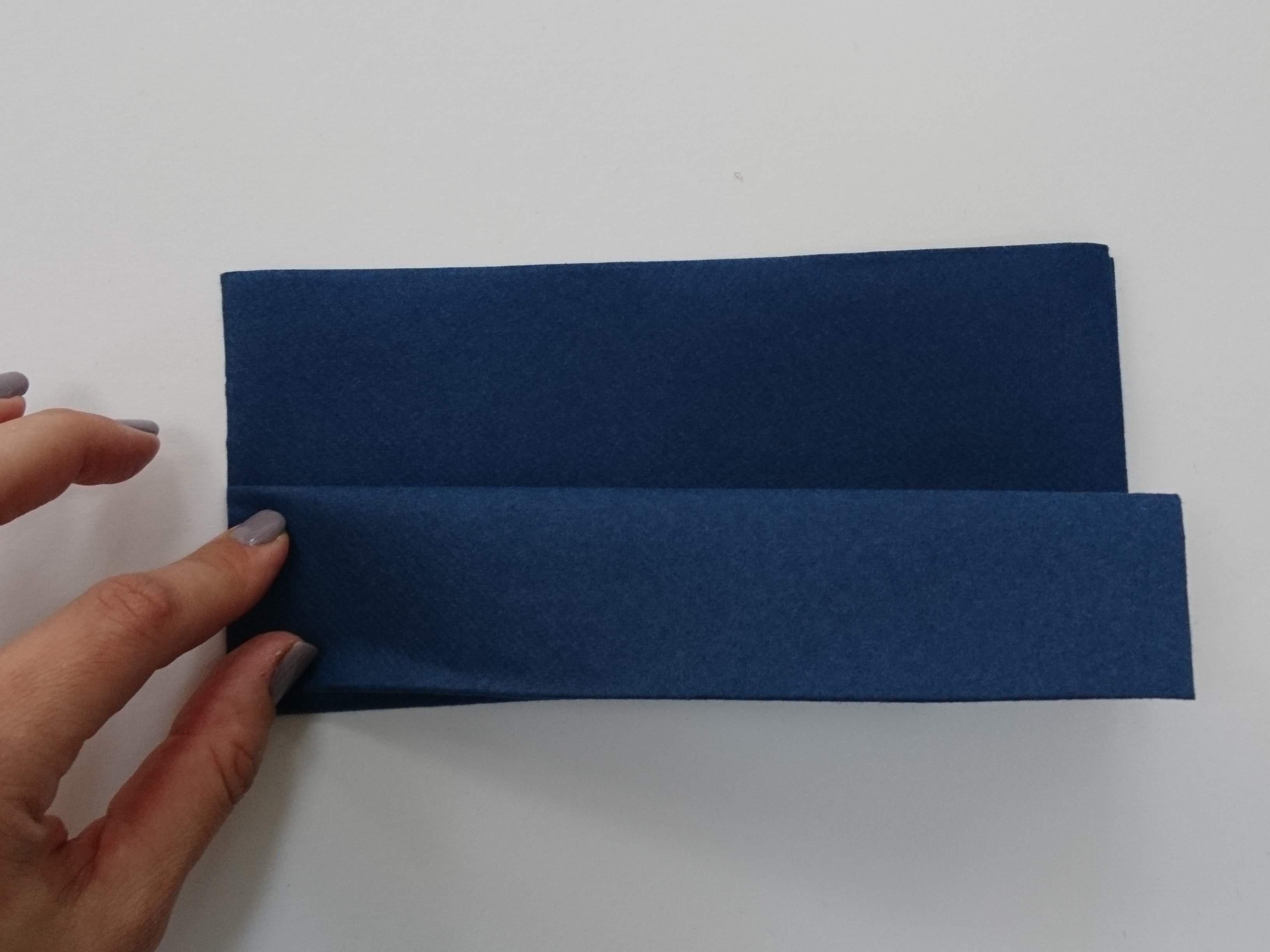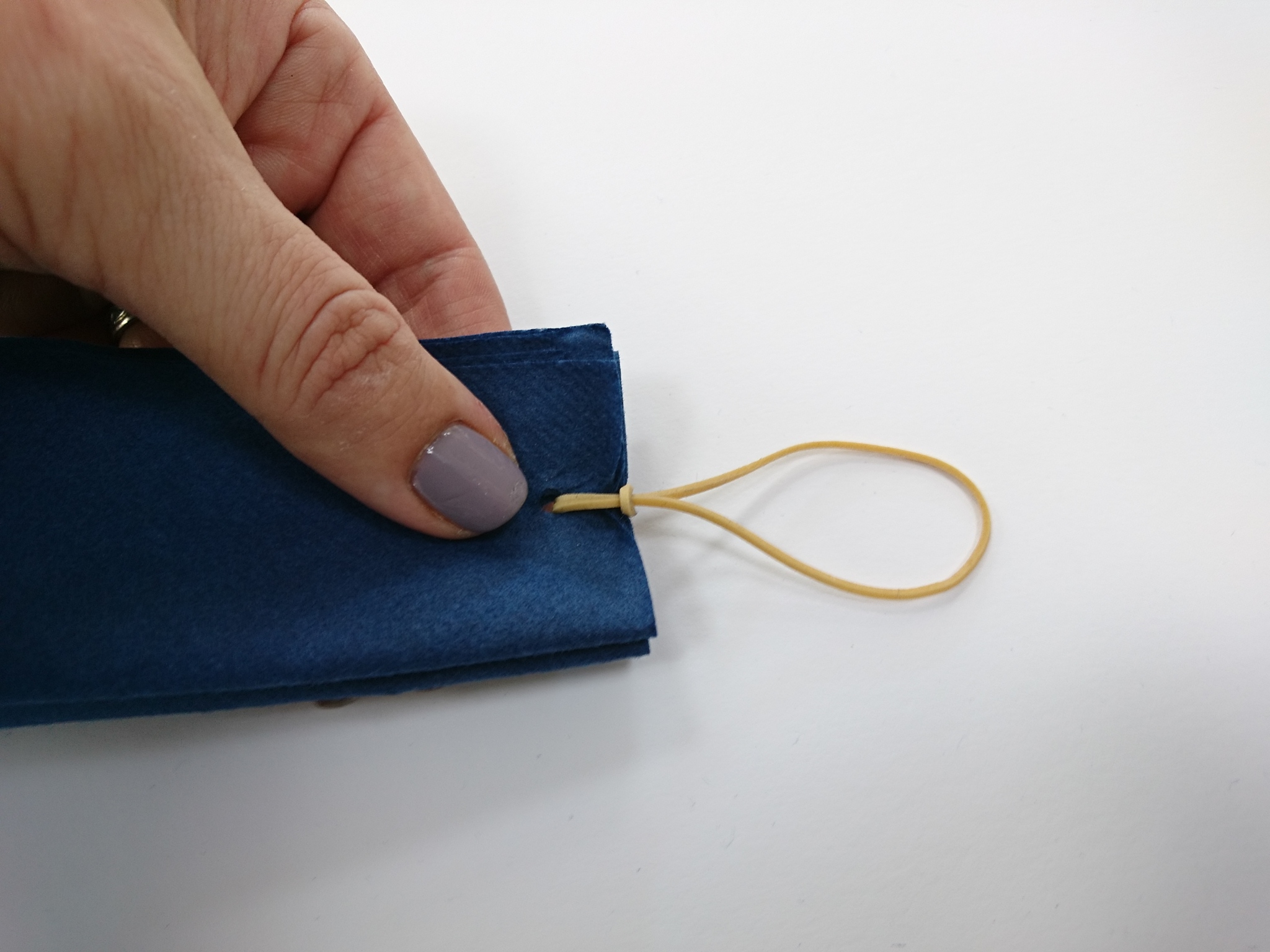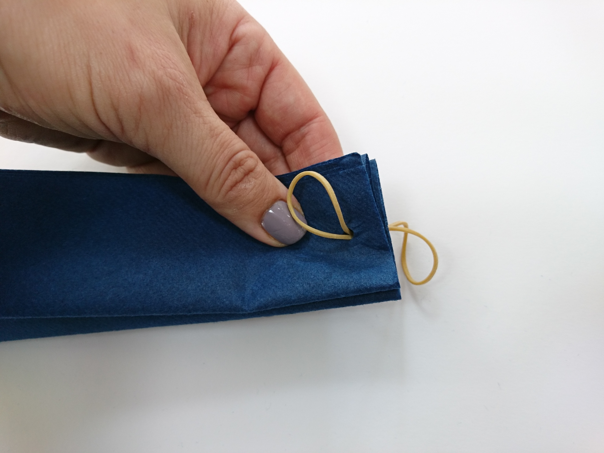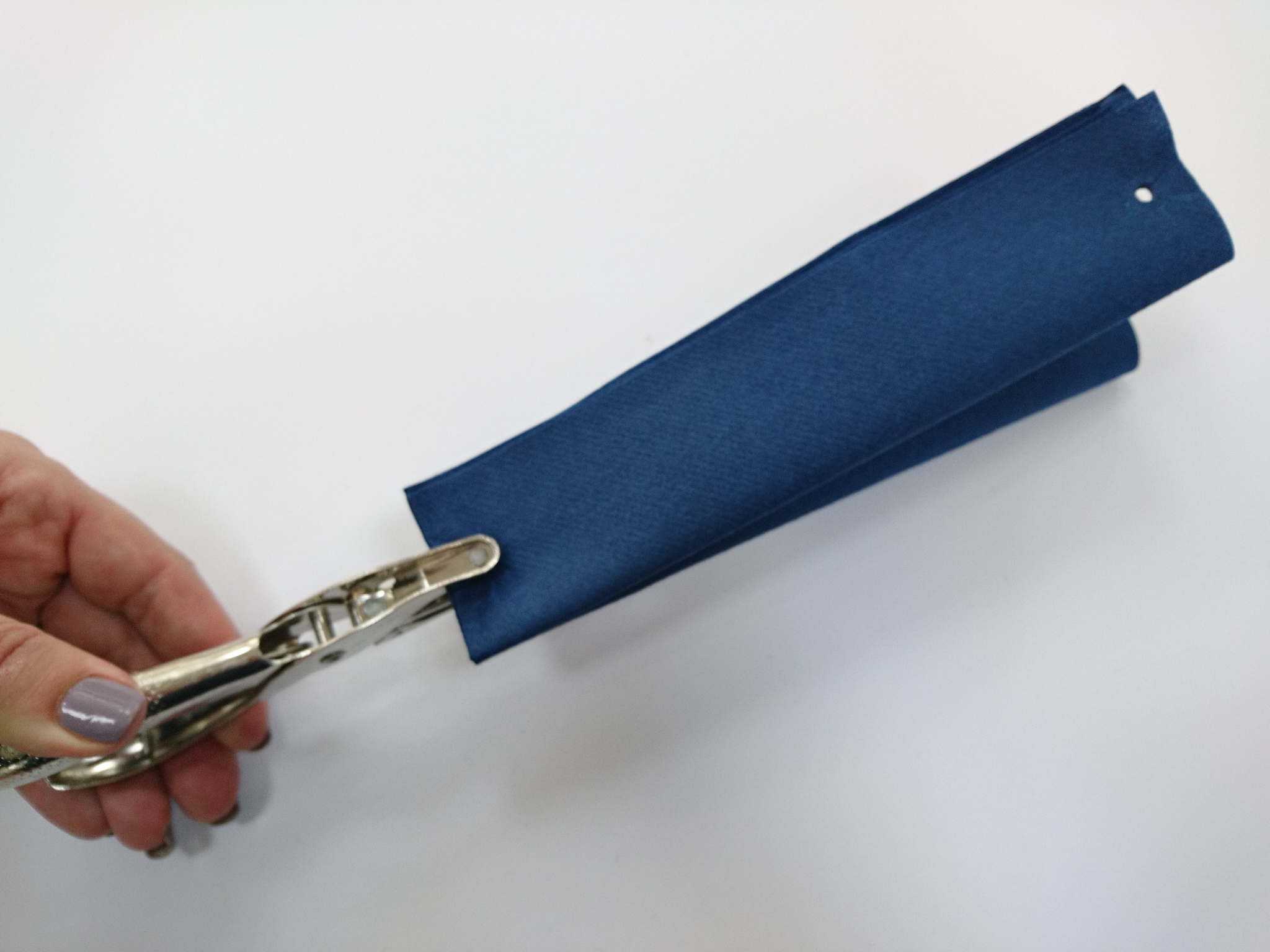 Zložen prtiček ob strani stisnemo s prsti in ga 1 cm od roba preluknjamo z luknjačem.