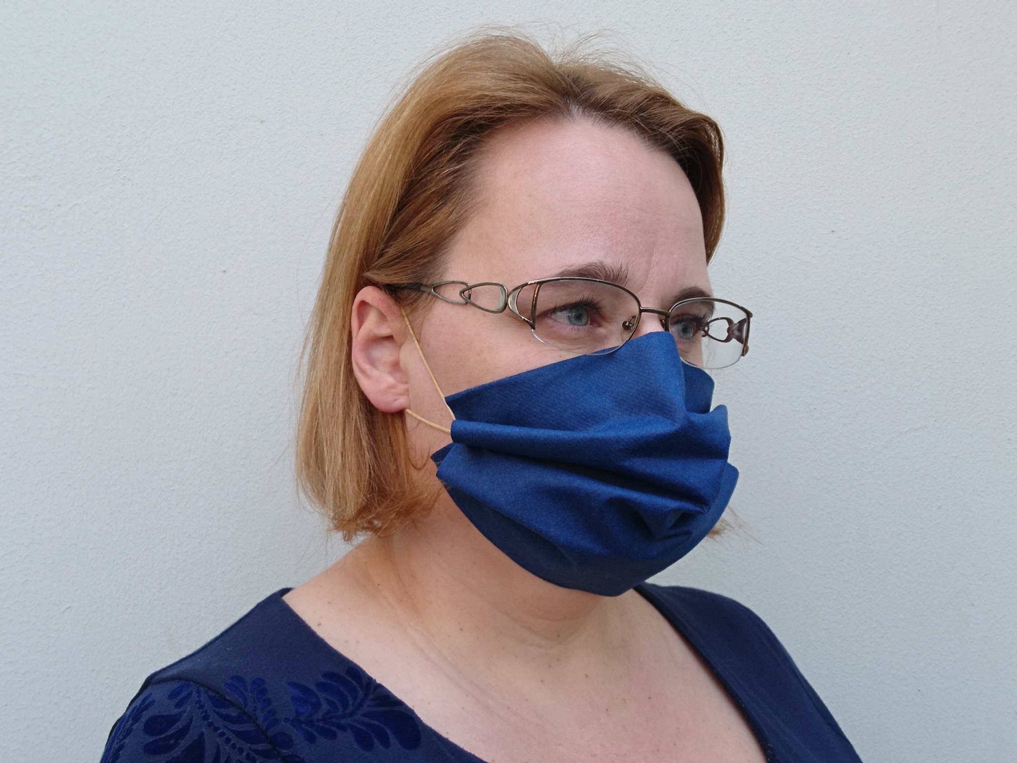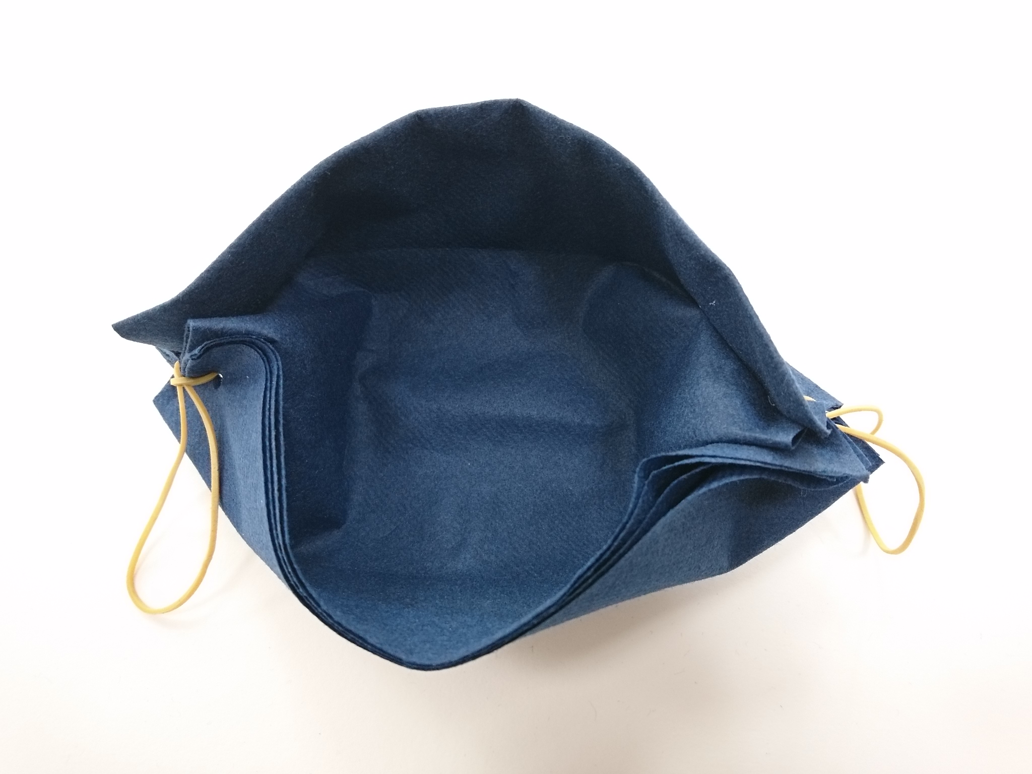 Masko previdno razpremo. Tako zložen prtiček nam da masko s štirimi sloji, razslojen del pa namestimo pod brado. Elastiki zataknemo za ušesa.