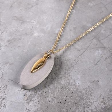 Morebitne grobe robove na obesku rahko pobrusimo s finim brusnim papirjem. S kleščami za nakit razklenemo manjša obročka in namestimo pero zlate barve. Večji obroček skozi luknjo namestimo na obesek iz cementa in nanj namestimo še pero.