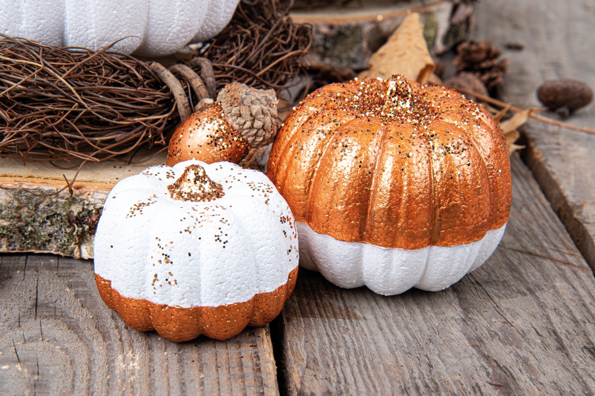 Ko se sloj bele barve posuši, lahko nadaljujemo z nanosom bronaste barve Extreme Sheen. Vzamemo večjo ter srednjo bučo, ter ju z največjim čopičem pobarvamo od vrha do polovice.