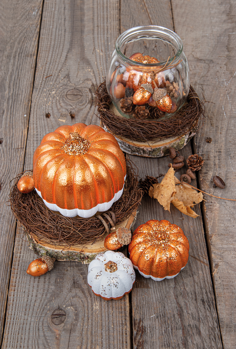 Pri najmanjši buči je nanos barve ravno obraten, torej je bronasta barva nanešena na spodnjem delu buče. Buča, ki se nahaja v vazi pa je v celoti pobarvana z bronasto barvo. Dokler je barva še mokra, s prsti nanesemo bleščice na peclje buč.