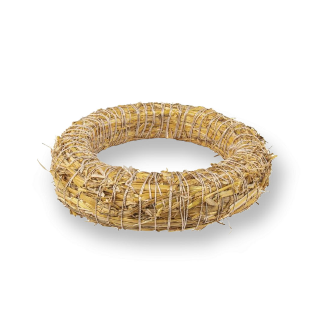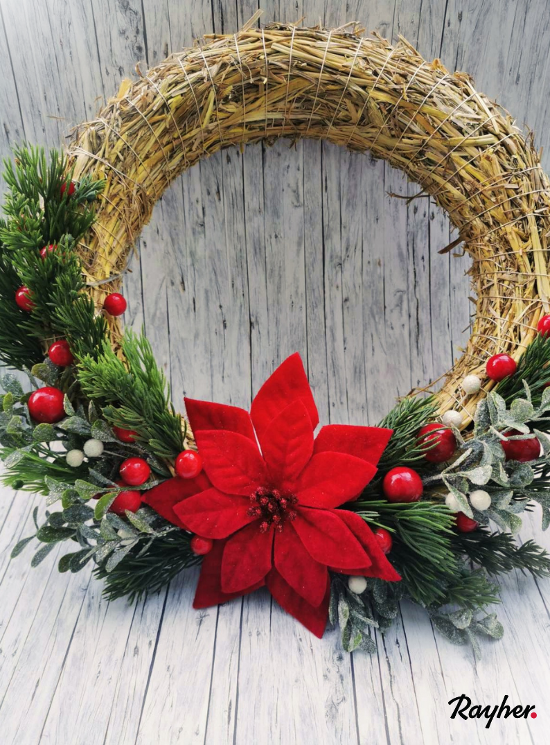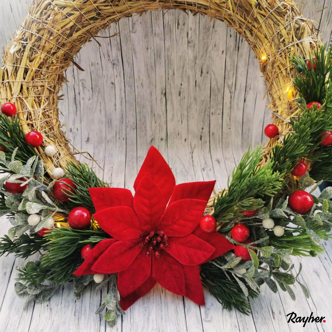 Koral 1 Za izdelavo venčka uporabimo slamnato osnovo premera 25cm. Korak 2 Pripravimo si vse uporaboljene izdelke, ter enega po enega zatikamo v vrvico, ki je ovita okrog osnove. Korak 3 Vejice lahko dodatno fiksiramo z vrvico ali žico. Korak 4 Na koncu, dodamo še lučke na baterije in naš venček je končan!