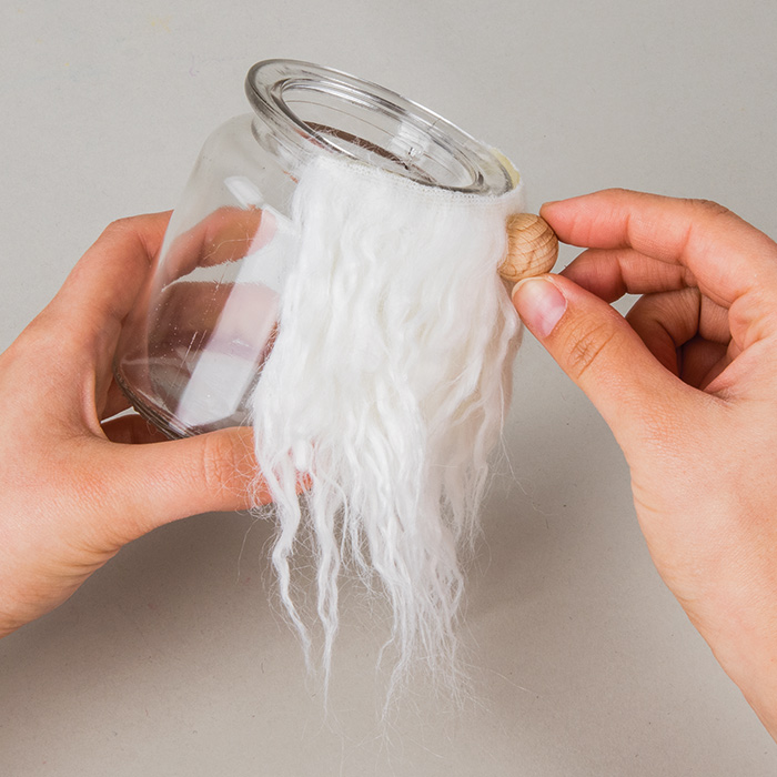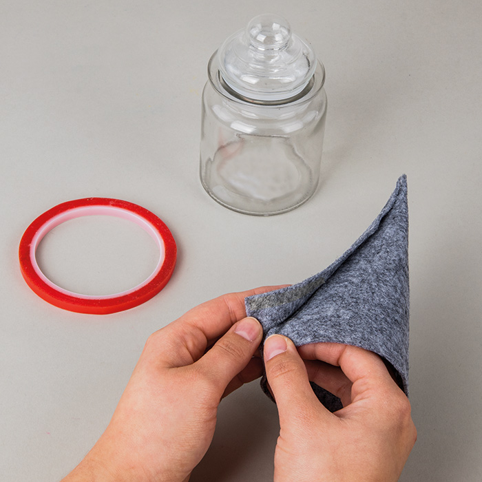 Z obojestranskim lepilnim trakom zlepite filc skupaj, da nastane koničast klobuk, ki se prilega stekleni posodici.