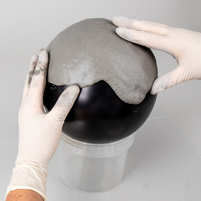 Betonsko maso z rokami nanesite na balon in maso rahlo modelirajte okoli balona. Betonska masa razvije rahlo pretočno gibanje, zato za to ne potrebujete velikega pritiska. Z dlanmi maso neenakomerno razporedite po balonu. To ustvarji drugačne in lepe robove na betonski lupini.