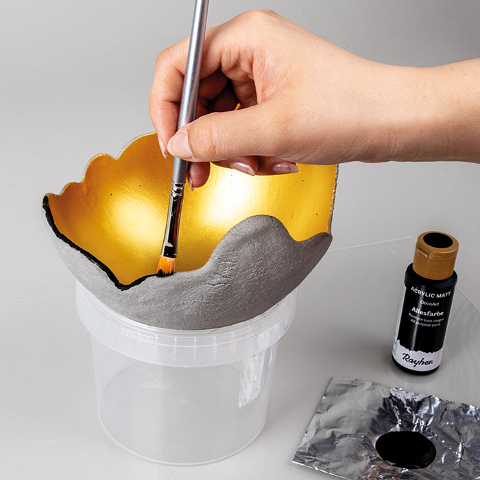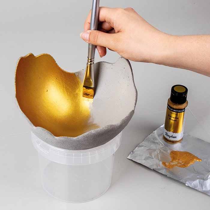 Notranjost betonske sklede v celoti pobarvajte z zlato akrilno barvo Extreme Sheen. Priporočamo dva sloja. Pustite, da se posuši.