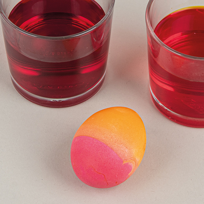 V steklenem kozarcu zmešajte dve različni barvi in jajce za nekaj minut potopite v eno od obeh barv, dokler ni do polovice potopljeno. Počakajte, da se jajce na kratko posuši, nato pa ga obrnite in potopite v drugo barvo. Barvi lahko tudi delno potopite/namočite eno na drugo. Barvo odcedite na kuhinjski papir in pustite, da se posuši.