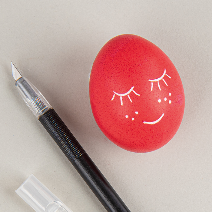 Kokošje jajce pobarvajte v skladu z osnovnimi navodili in pustite, da se dobro posuši. Na pobarvano jajce najprej s svinčnikom narišite motiv. S skalpelom (previdno in natančno ter z rahlim pritiskom) popraskajte po pobarvani površini jajca, tako da se ponovno pojavi bela lupina.