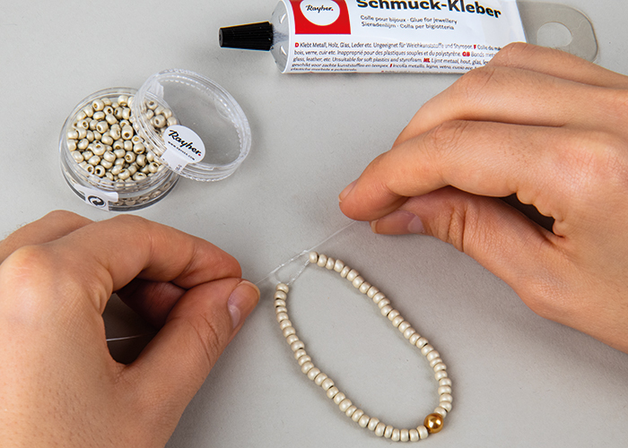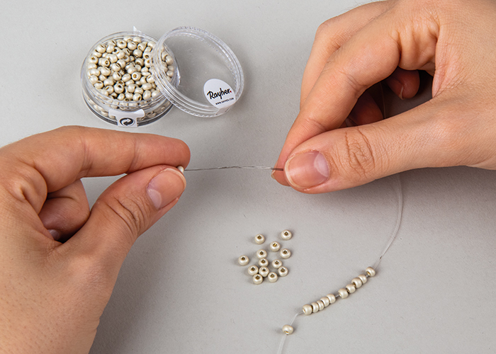 Odrežite 30 cm magične raztegljive niti in nanjo z iglo za nanizanje perlic nanizajte izbrane kroglice.