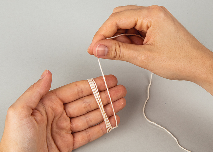 Približno 1,2 m svetle bež bombažne preje osemkrat ovijte okoli iztegnjenih štirih prstov. Nit prerežite.