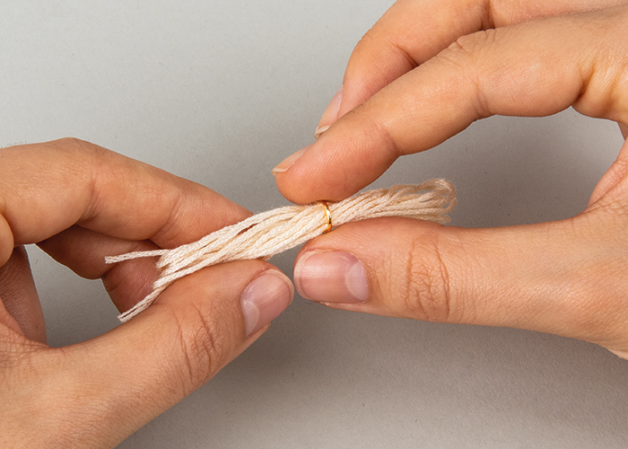 Vstavite snopič preje do polovice v 8 mm rinko. Konca prepognite skupaj in navzdol zgladite niti.