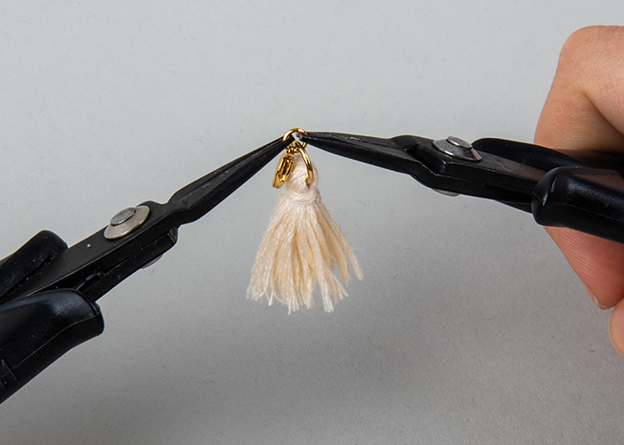 Vstavite obroček karabinčka kot povezovalni element med karabinčkom in obročkom cofka. Za to uporabite klešče za nakit.