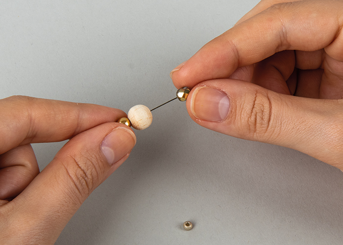 Na paličico za nakit namestite renesančno stekleno voščeno perlico, surovo leseno kroglico, stekleno brušeno kroglico in na koncu kovinski perlico.