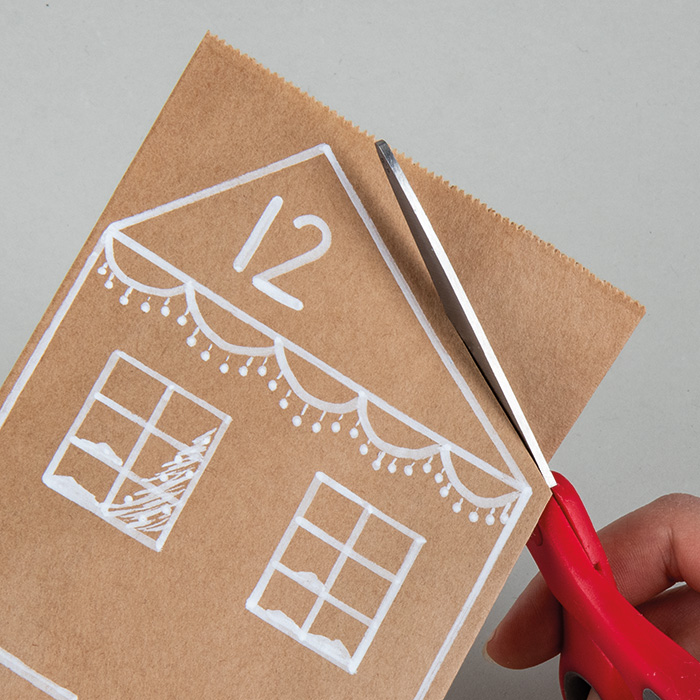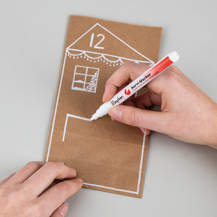 Korak 1Vzemite papirnato vrečko in z Rayher akrilnim markerjem narišite hiško, kot vam je všeč. Za navdih lahko uporabite hiške na sliki.