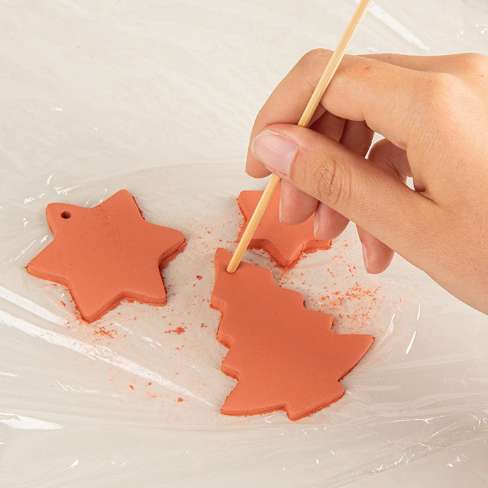 Z lesenim nabodalom ( leseno paličico) naredite luknjo v modelirno maso na želenem mestu. Izdelane okraske iz mase odložite na stran, da se posušijo. Modelirna masa se popolnoma posuši šele po približno dveh dneh.