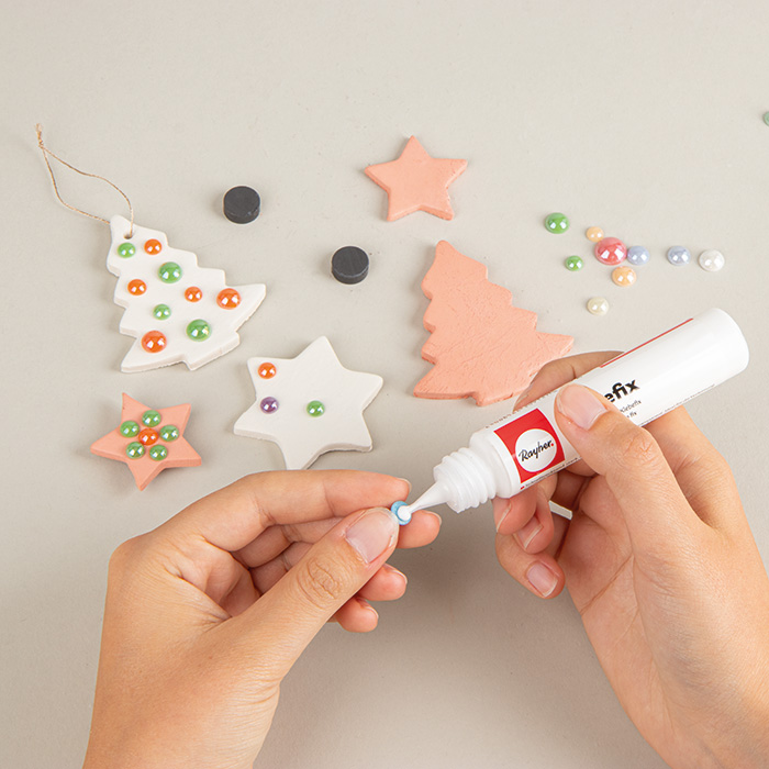 Ko se motivi popolnoma posušijo, lahko prilepite kamenčke iz diamantnega mozaika v različnih vzorcih. Z lepilom Rayher Klebefix je to zelo enostavno. Za magnete za hladilnik z lepilom Klebefix pritrdite po en magnet na hrbtno stran vsakega motiva.