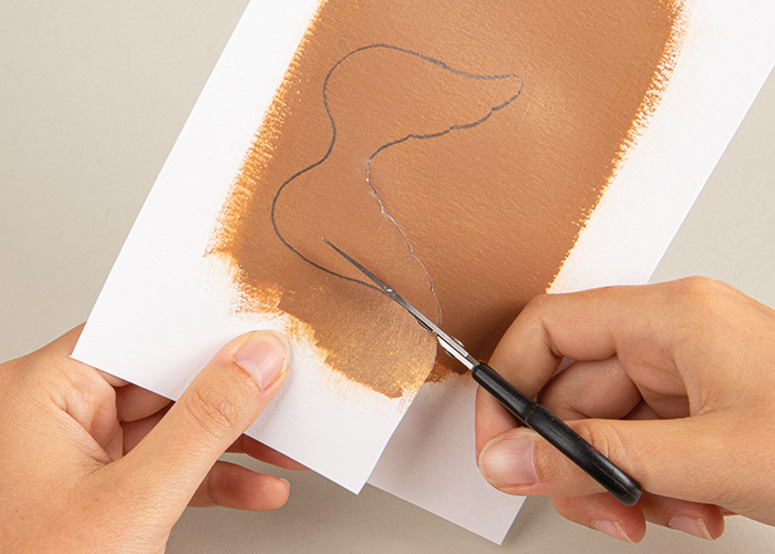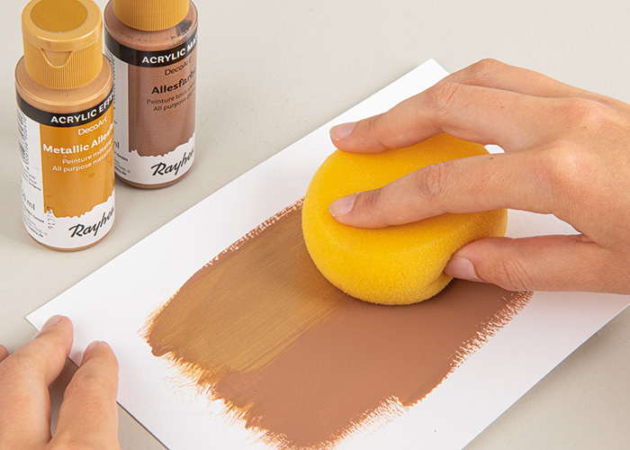 Z akrilno barvo nougat pobarvajte bel papir na površini približno 10 × 10 cm. Ko se barva posuši, jo lahko obrišete. To storite tako, da z vlažno slikarsko gobo nanesete briljantno zlato kovinsko barvo in jo diskretno obrišete po površini v barvi nougat.