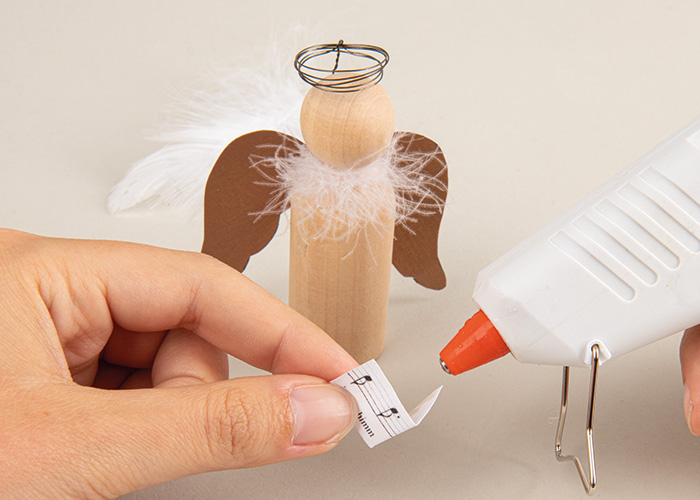 Za dokončanje angela varuha najprej prilepite okrasno pero, nato avreolo in krila na zgornji del hrbta ter z dvema majhnima lepilnima pikama pritrdite notno knjigo.