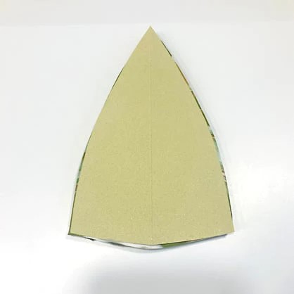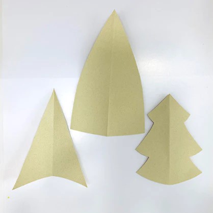 Korak 1Najprej se odločite, kako velika in kakšne oblike naj bodo drevesa. Za vsako drevo izdelajte predloge iz papirja ali kartona. Papir sem prepognite na pol in s škarjami izrežite poenostavljene oblike dreves skozi obe plasti papirja, pri čemer kot sredino uporabite linijo prepogibanja. Nato papir odprite, da se vam pokaže oblika. Če želite obliko spremeniti, preprosto ponovno prepognite papir in ponovno izrežite. Največje drevo na sliki je visoko približno 15 cm.