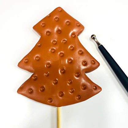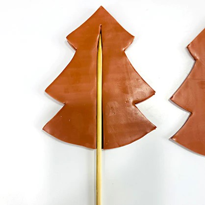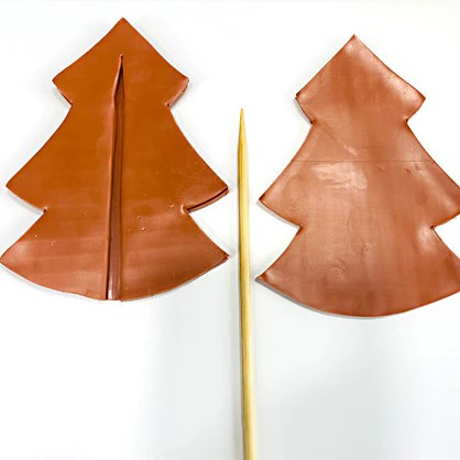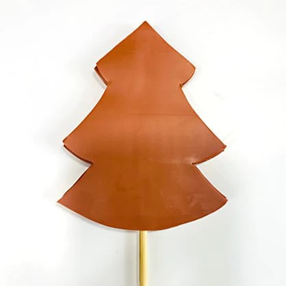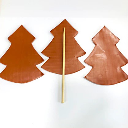 Za drevesce iz terakote uporabite PREMO! Sculpey 57 g Terra Cotta, pregnetite maso skozi strojček za testenine z najdebelejšo nastavitvijo ali z akrilnim valjčkom. Izrežite tri oblike drevesa.