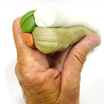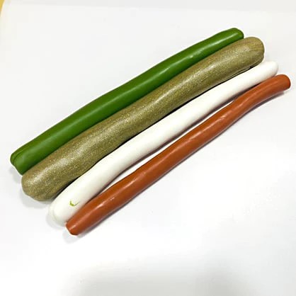 Za marmorirano drevo začnite z polovico mase bele barve, eno celo maso Yellow Gold Glitter in ostanki drugih barv. Vsak del zvijemo v enako dolge vrvi.