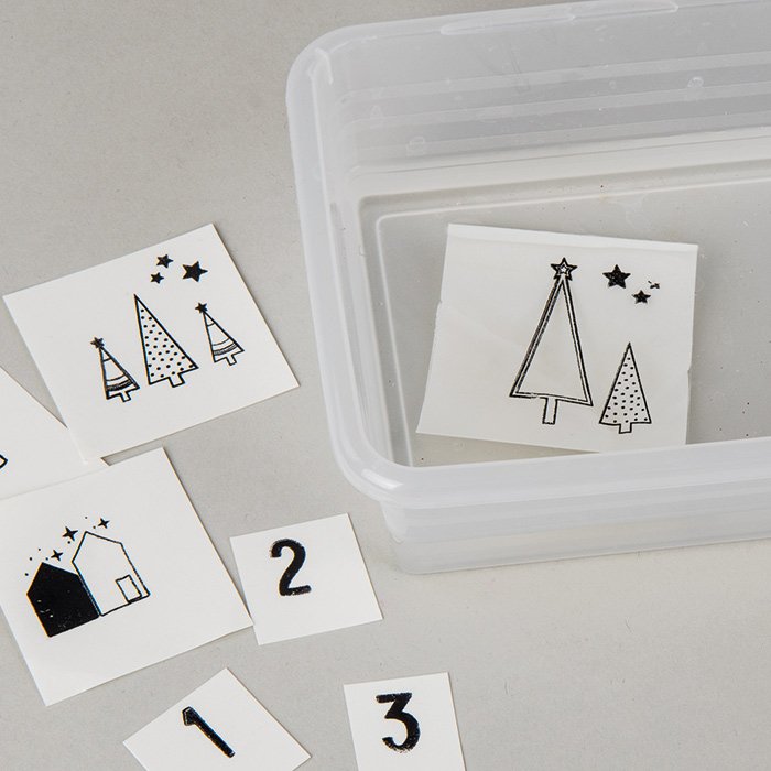 Nato izrežite odtisnjen motiv z ozkim robom okoli motiva in ga postavite v mlačno vodo za približno 30-60 sekund, dokler se nosilni papir ne začne ločevati od folije.