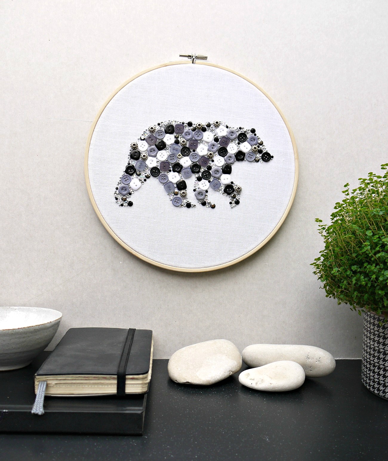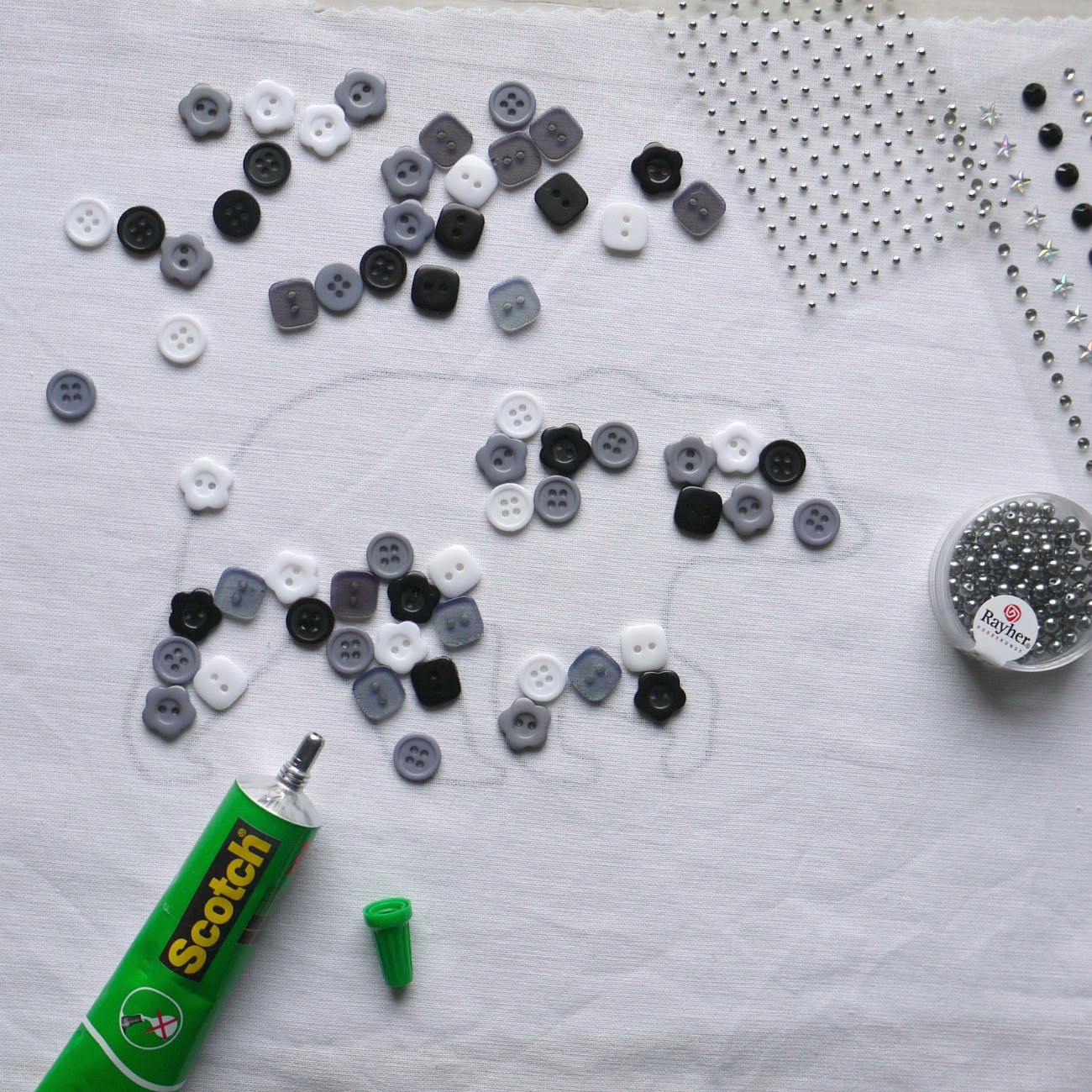 Ustvarjalne ideje Postopek Potrebujete:Najprej na blago narišete/prerišete medeveka.Gombe nalepite na blago z lepilom, ki je primerno tudi za tekstil.