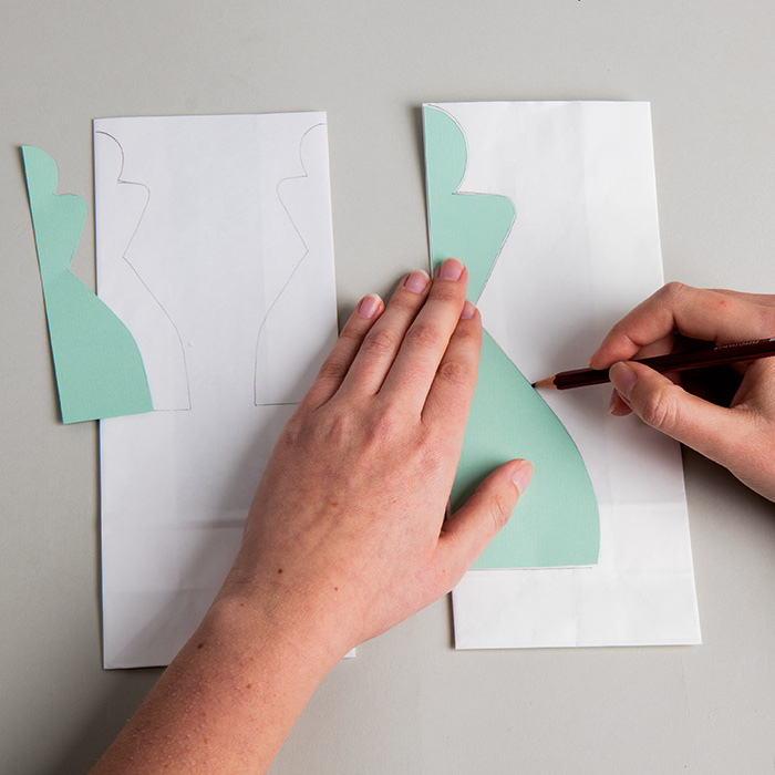 Iz tršega kartona si pripravi šablone (angela in krila). Šablono angela položi na papirnato vrečko s ploščatim dnom (spodnja stran naj bo zadaj) in s svinčnikom obriši obris šablone.