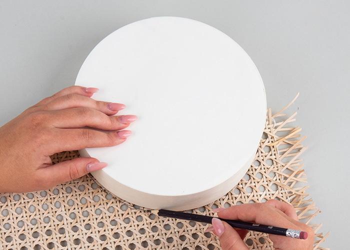 Odprto stran lesene škatle položite na hrbtno stran ratan pletenine tako, da bo vzorec potekal vodoravno in da bo višina izreza približno 9 cm. S svinčnikom obrišite obris in ga izrežite. Ratan pletenino pritrdite na rob škatle z vročim lepilom.