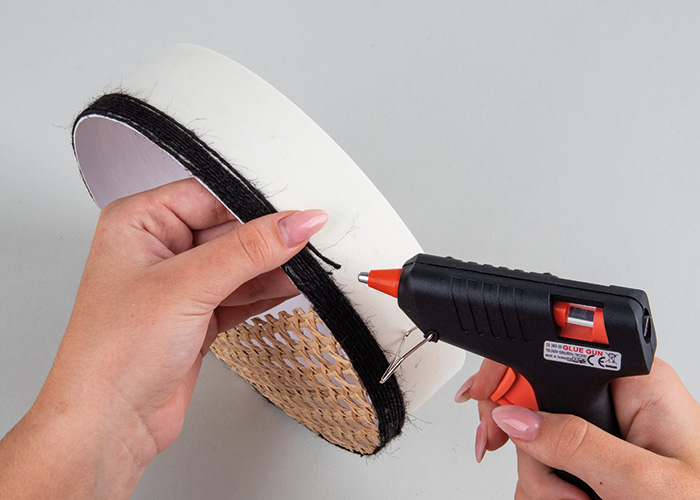 Črno vrvico odvijte v širini 1,5 cm okoli zunanjega zgornjega roba in jo pritrdite z vročim lepilom.
