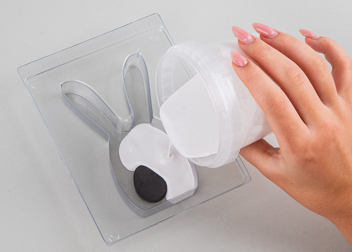 Po navodilih zmešaj Raysin maso z vodo in z njo napolni oba modelčka. Po 240 minutah sušenja za velikega zajčka in 180 minutah za malega, lahko previdno odstraniš zajčke iz modelov in odstraniš vstavke.