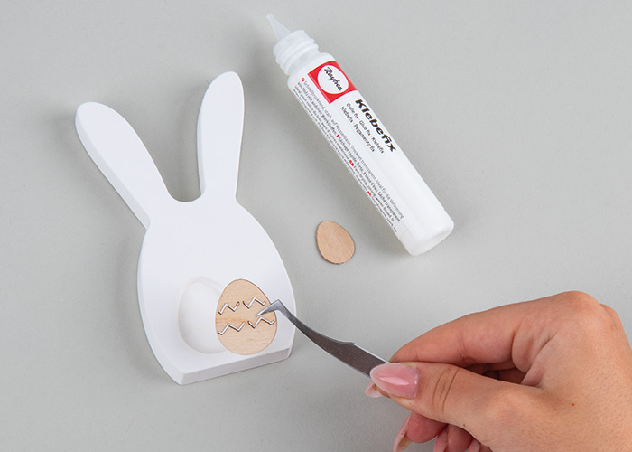 Na malega zajčka s pomočjo lepila Klebefix-Pen prilepi leseno jajce v vdolbino ter nanj še leseno jajce iz furnirja.