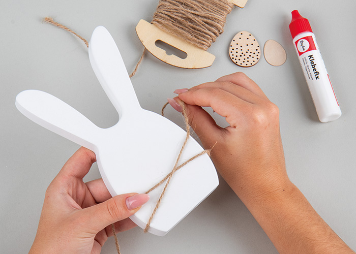 Odreži 60 cm juta vrvice in jo dvakrat ovij okoli velikega zajčka. Nato nanjo prilepi leseno jajce, leseno jajce iz furnirja in dekorativno perje.