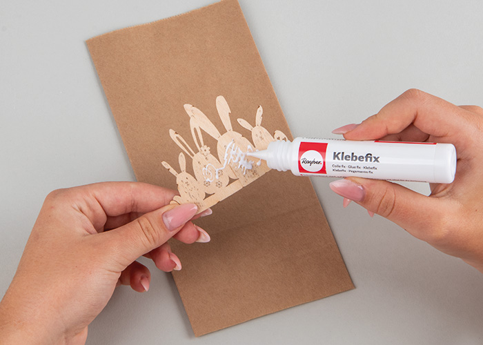 Papirnato vrečko položi predse in nanjo prilepi pobarvane izreze, približno 1,5 cm od spodnjega roba.