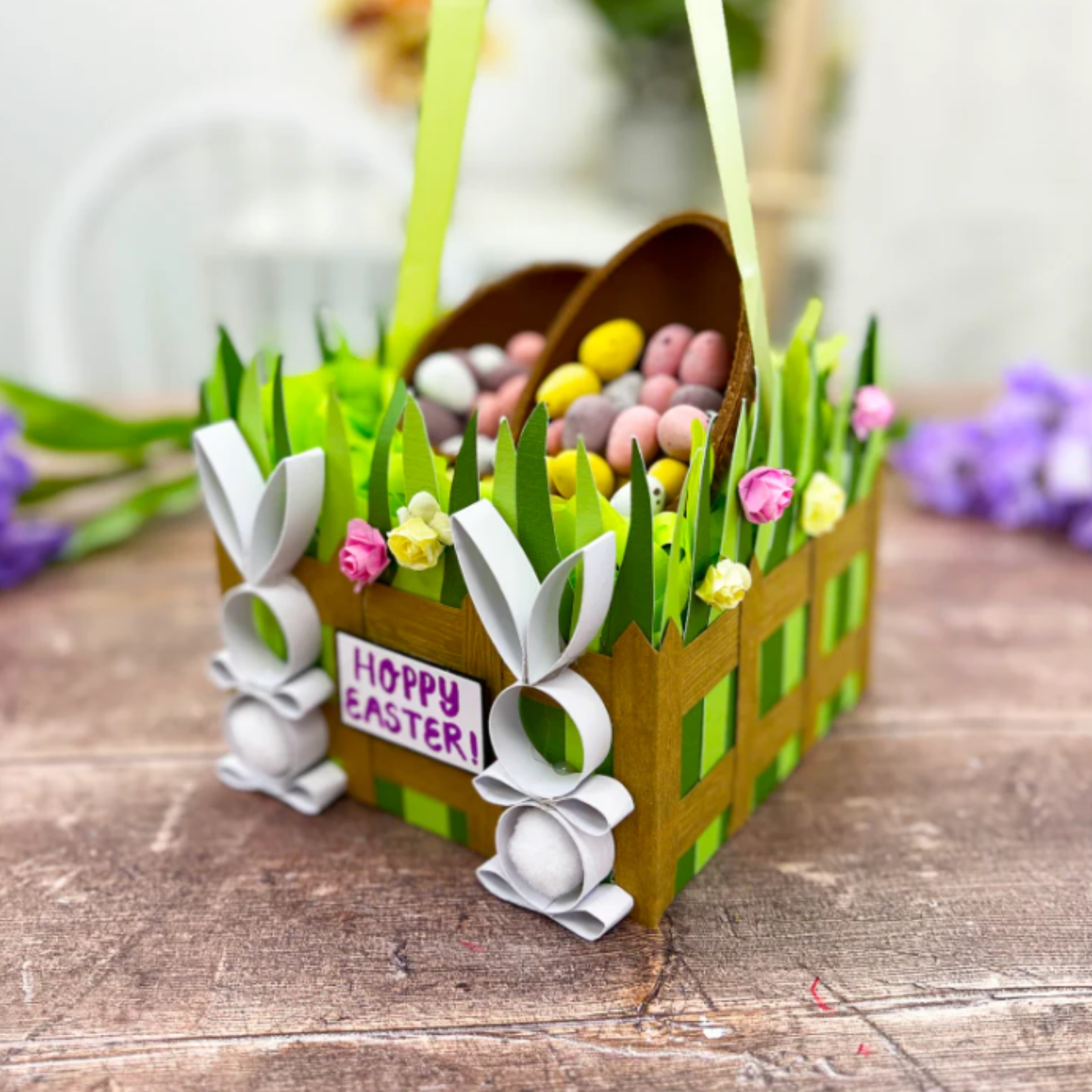 Iz vtisnjenega kartona izrežite 8 trakov velikosti 1,9 cm x 15 cm in jih nalepite vodoravno čez travo – enega na sredino in enega blizu dna košarice.