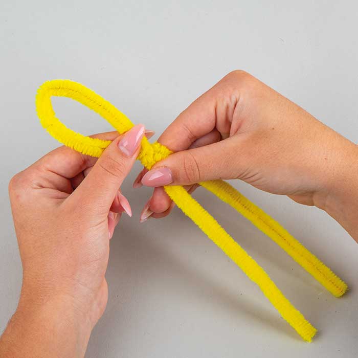 1. korak – Cvetni listiZa sončnico potrebuješ skupno 20 cvetnih listov – 10 večjih in 10 manjših. Kosmato žičko prepogni na polovico in naredi zanko približno 8 cm od konca – zavrti jo dvakrat.