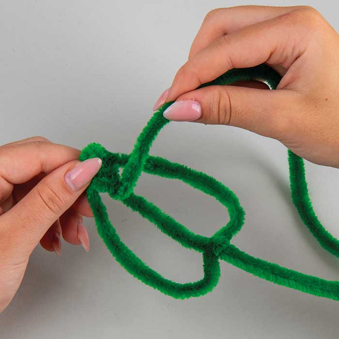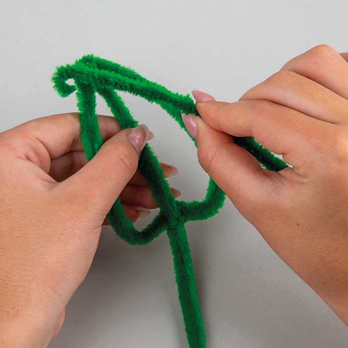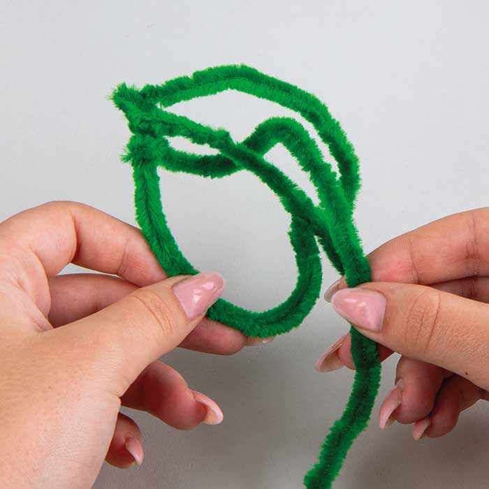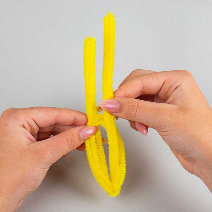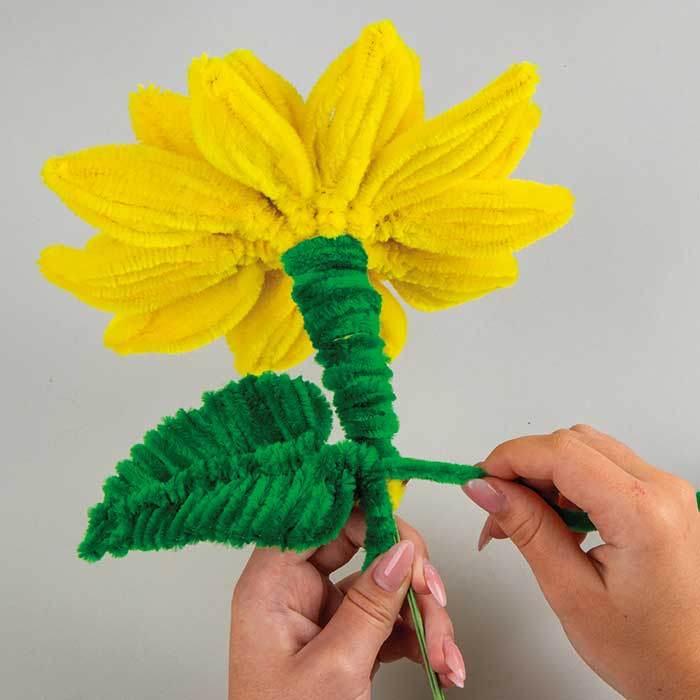 Za liste sončnice potrebuješ po 4 zelene kosmate žičke. Vsako žičko prepogni na polovico in po približno 13 cm dolžine naredi zanko, ki jo zvij skupaj.