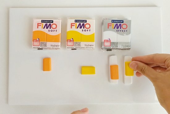 Odreži 2 kosa FIMO effect translucent white, polovico koščka FIMO soft tangerine in polovico koščka sunflower.