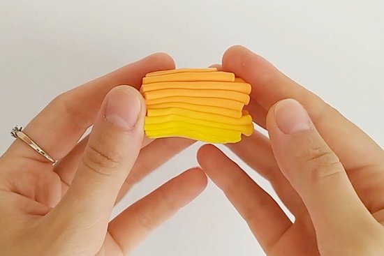 Ustvari barvni prehod od rumene do oranžne. Za tako zmešane barve razvaljaj v ploščo debeline približno 3 mm z akrilnim valjčkom. Obe plošči prereži na dva trikotnika in jih stisni skupaj na robu.