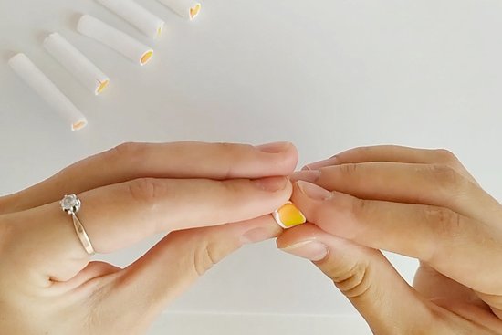 Zdaj vsak trak oblikuj v kapljičasto obliko. Svetlo rumeni konec bo konica kaplje.