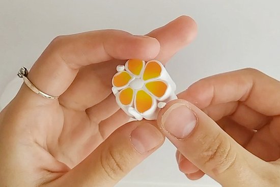 Sestavi palico: Vzemi bel trak iz FIMO mase. Okoli njega razporedi kapljičaste trakove v krogu in jih rahlo pritisni skupaj. Konice kapljic (svetlejši del) naj gledajo navznoter. Ko sestaviš vse kose, zapolni zunanje vrzeli s tankimi belimi trakovi iz FIMO mase, da se odprtine zaprejo.