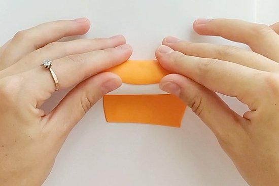 Nato dolg barvni trak prepogni kot harmoniko od rumene proti oranžni barvi. Nežno pritisni na trak, da ga podaljšaš in stanjšaš (temu pravimo redukcija), da dobiš dolgo “klobaso”, kjer je oranžna na vrhu in rumena na spodnjem delu.