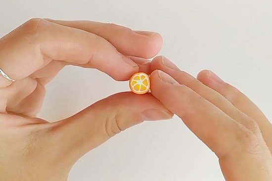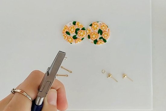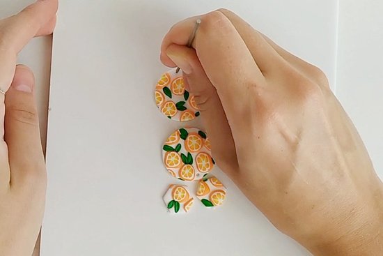Zdaj nareži tanke rezine s palice in jih položi na pripravljeno belo osnovno ploščo. Oblikuj majhne listke iz FIMO soft tropical green in jih z iglo razporedi med rezine pomaranče. Ko je plošča lepo okrašena s pomarančami, z okroglim modelčkom za piškote izreži uhane. Na zgornjem robu vsakega uhana naredi luknjo.