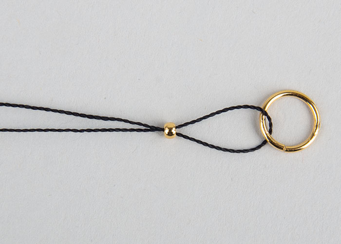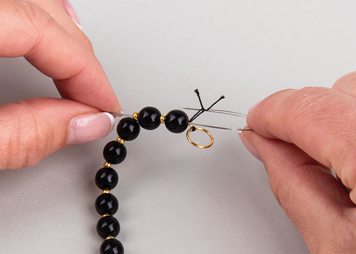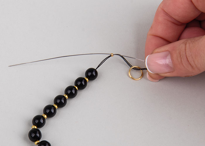 Za zapiranje najprej nanizaj še eno perlo za stiskanje. Nato napelji nitko skozi drugi obroček in jo spelji nazaj skozi perlo za stiskanje.
