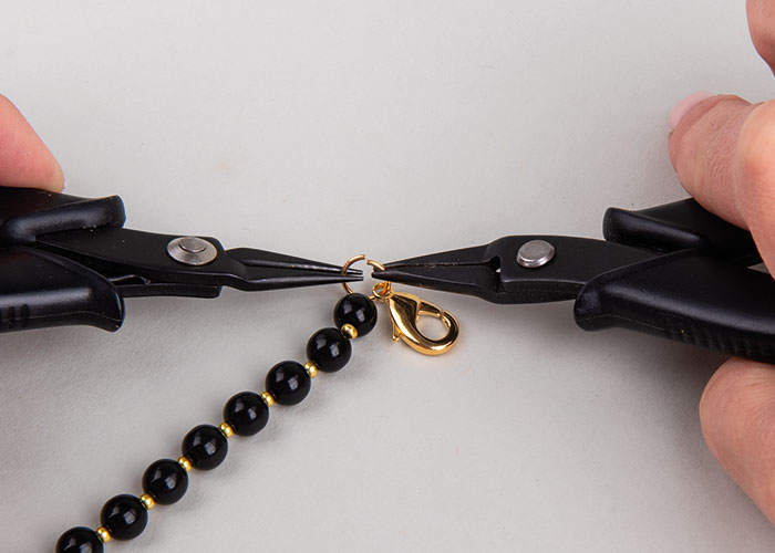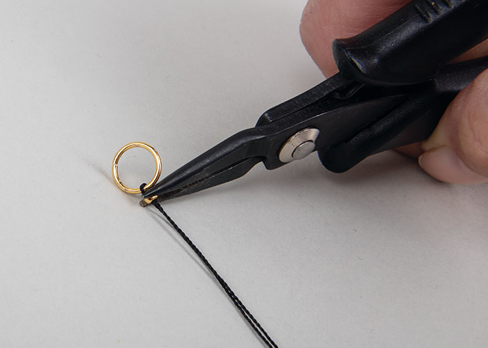 Z okroglimi kleščami rahlo odpri oba obročka, v vsak obroček vstavi karabin, nato obročka spet zapri.