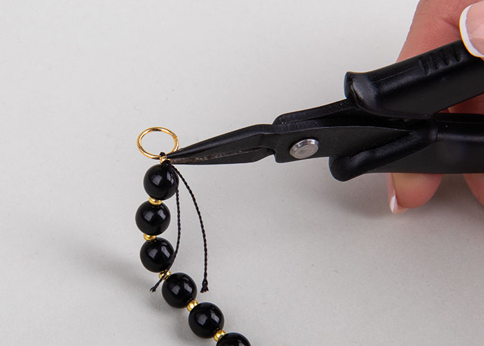 1.korakNapelji nitko za nizanje skozi kovinski obroček in ga potisni na sredino niti. Obe nitki vstavi v posebno iglo za perle in nanizaj perlo za stiskanje.